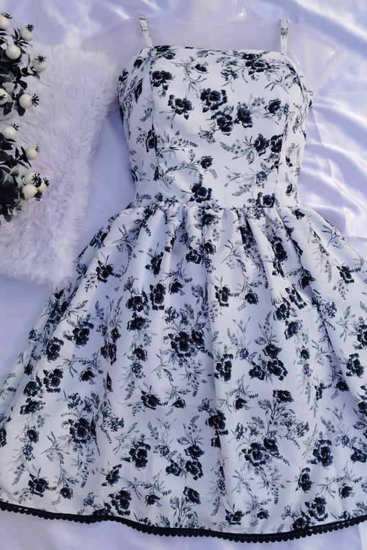 WHITE BLUE FLORAL PRINT STRAP DRESS