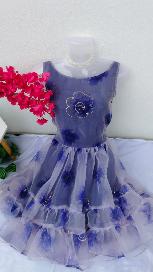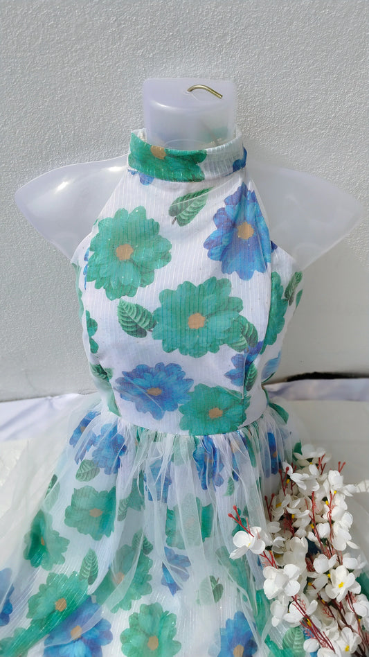 WHITE & BLUE FLORAL PRINTED ORGANZA TIERED DRESS