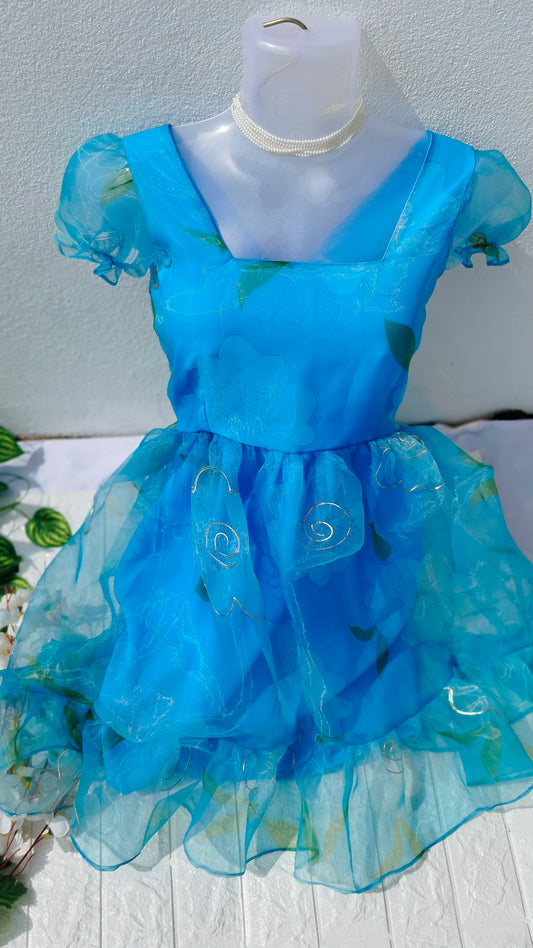 SKY BLUE FLORAL PRINTED ORGANZA TIERED SHORT DRESS