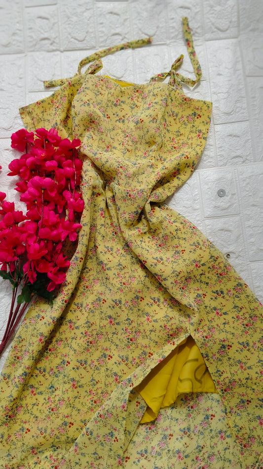 YELLOW FLORAL PRINTED GEORGETTE SLIT DRESS