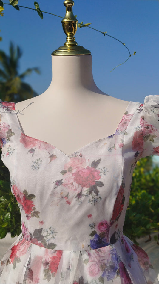 WHITE FLORAL PRINTED SHORT ORGANZA DRESS